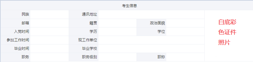 彩色照片底色为白色;填写邮箱(接收缴费电子票据用);籍贯具体到“省 县”,不需填到“乡镇、村庄”;入党时间(批准为预备党员的时间),参加工作时间与简历要一致,出生日期、参加工作时间和入党时间均须与人事档案认定一致;毕业时间、院校与毕业证要一致;职务栏字数不宜超过8个字(没有职务的填写“无”),职务级别栏选填相应的级别(没有职务级别的选填“其他”),职称栏选填相应的职称(没有职称的选填“无”)。